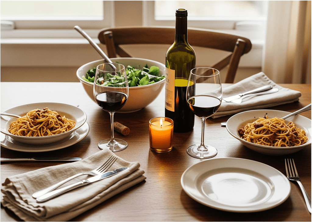 Two friends on a Wednesday. Pasta, a salad, one bottle.